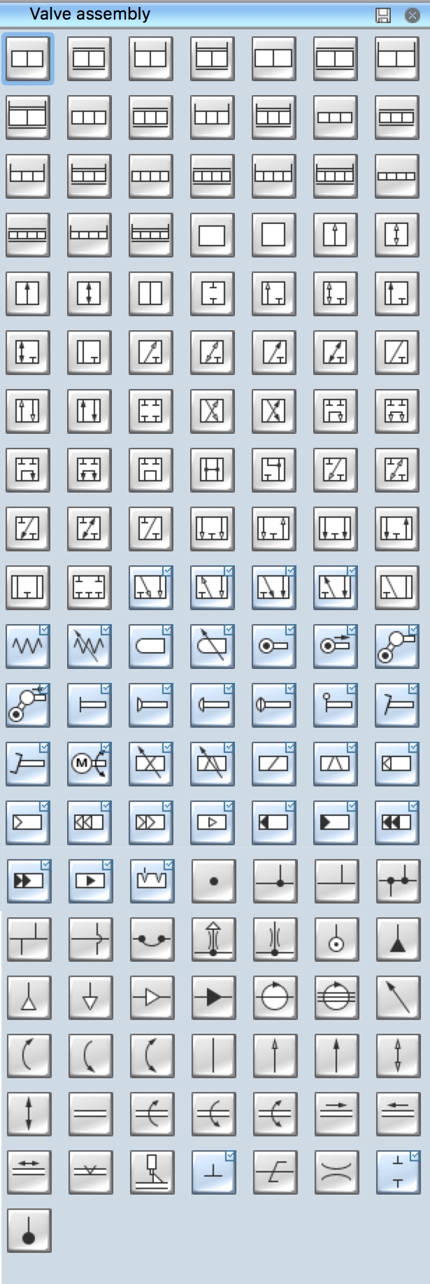 The vector stencils library "Valve Assembly" contains 141 symbols of pressure and flow regulators, flow direction indicators, controls, and symbols to design flow paths of control valves. Use these valve assembly shapes to design the engineering drawings of hydraulic and pneumatic valve assemblies in fluid power systems.