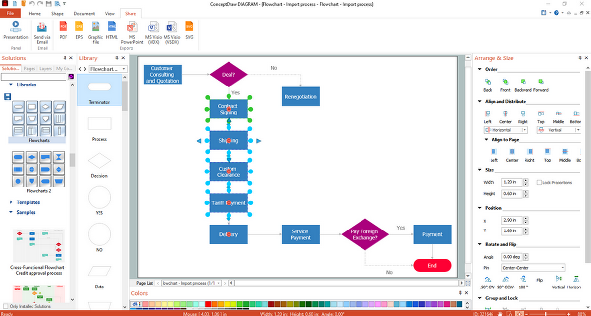 The Flowcharts Solution includes symbol libraries and reusable templates for building process flow diagrams in a structured desktop environment.
