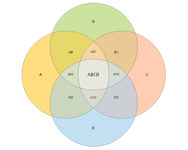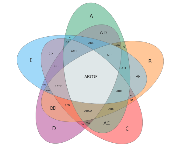 This example illustrates the 5-Set Venn Diagram Template which was designed for ConceptDraw DIAGRAM users and can be opened for filling from the Business Diagrams solution section in ConceptDraw STORE. Now, thanks to ConceptDraw DIAGRAM designing the Venn Diagram of any complexity on the base of template will take only few minutes.