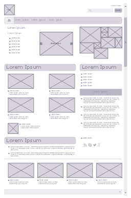 Website wireframe example, vertical scrollbar, tree expand icon, search icon, search form, search button, paragraph, text, menu item central, menu bar, logo, image, horizontal separator line, full screen, home button, heading, dropdown button active, drop-down button active, collage, bulleted list, unordered list, bullet symbol, box crossed, Twitter icon, Skype icon, RSS feed icon, Google icon, 3D slideshow,