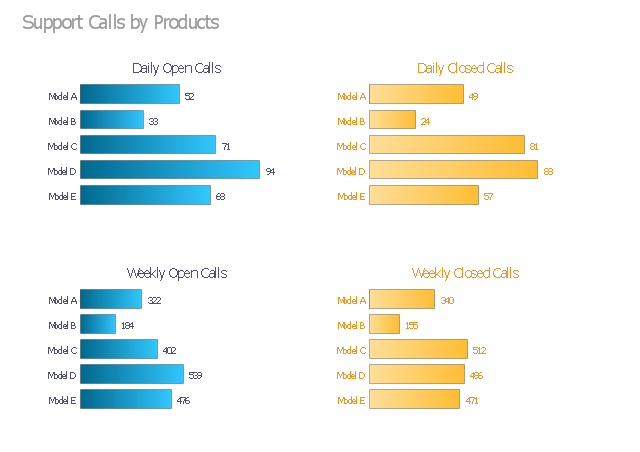 The visual dashboard example "Support calls by products" contains 4 horizontal bar charts used for the comparison of support calls data by products. "Dashboards often provide at-a-glance views of KPIs (key performance indicators) relevant to a particular objective or business process (e.g. sales, marketing, human resources, or production). ... Dashboards give signs about a business letting the user know something is wrong or something is right. The corporate world has tried for years to come up with a solution that would tell them if their business needed maintenance or if the temperature of their business was running above normal. Dashboards typically are limited to show summaries, key trends, comparisons, and exceptions." [Dashboard (business). Wikipedia] The business dashboard example "Support calls by products" was created using the ConceptDraw PRO diagramming and vector drawing software extended with the Comparison Dashboard solution from the area "What is a Dashboard" of ConceptDraw Solution Park.