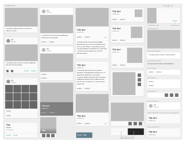 Card elements, supporting text, content block, supporting text, supplemental action, rich media, content block, card picture, rich media, content block, primary title block, media area, icon toggles, flat button, divider, cards, card picture, actions content block, action button,