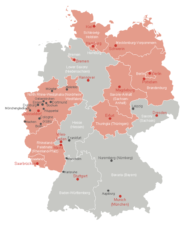 This Germany thematic map example was created on the base of Wikimedia Commons file: Deutschland Bundesländer mit Informationsfreiheitsgesetzgebung.svg. [commons.wikimedia.org/wiki/File:Deutschland_Bundesl%C3%A4nder_mit_Informationsfreiheitsgesetzgebung.svg] This file is licensed under the Creative Commons Attribution-Share Alike 2.0 license. [creativecommons.org/licenses/by-sa/2.0] "In Germany, the federal government passed a freedom of information law on September 5, 2005; it was last updated on August 7, 2013. The law grants each person an unconditional right to access official federal information. No legal, commercial, or any other kind of justification is necessary. Nine of the sixteen Bundesländer—Berlin, Brandenburg, Nordrhein-Westfalen, Schleswig-Holstein, Hamburg, Bremen, Mecklenburg-Vorpommern, Saarland and Thüringen—have approved individual "Informationsfreiheitsgesetze" (Freedom of Information laws)." [Germany. Freedom of information laws by country. Wikipedia] The thematic map example "Map - States of Germany with Freedom of Information Legislation" was designed using the ConceptDraw PRO software extended with the Map of Germany solution from the Maps area of ConceptDraw Solution Park.