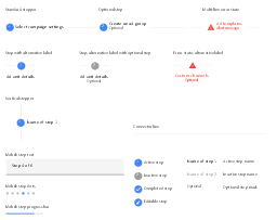 Stepper elements, step alternative label, standard stepper, horizontal stepper, optional step, multi-line error state, mobile step text, mobile step progress bar, mobile step dots, inactive stepper circle, inactive step, error state alternative label, editable step, drawing shapes, connector line, completed step, active stepper circle, active step, Vertical stepper,
