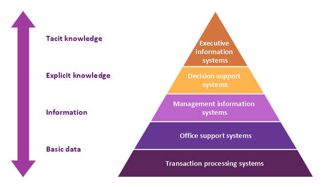 A five level pyramid model of different types of Information Systems based on the information processing requirement of different levels in the organization. The first level represents transaction processing systems to process basic data. The second level represents office support systems to process information in office. The third level represents management information systems to process information by managers. The fourth level represents decision support systems to process explicit knowledge. The fifth level represents executive information systems to process tacit knowledge.