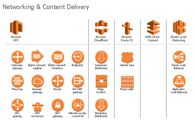 The AWS icons example "Design elements - AWS Networking and Content Delivery" is included in the AWS Architecture Diagrams solution from the Computer and Networks area of ConceptDraw Solution Park.