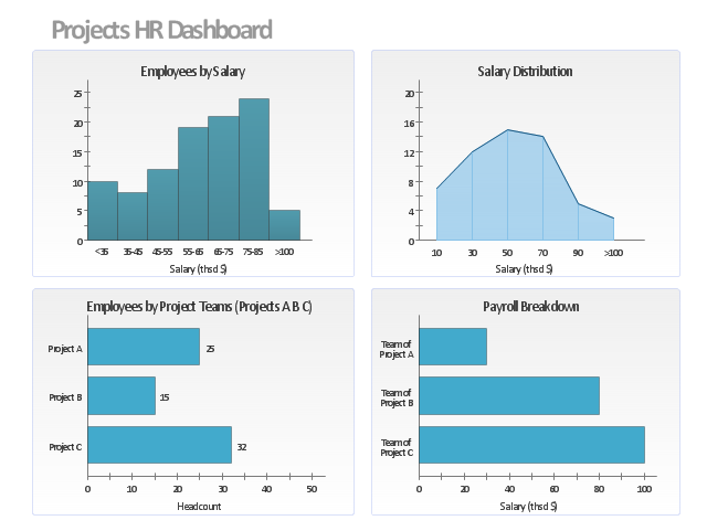 The example "Projects HR dashboard" was created using the ConceptDraw PRO diagramming and vector drawing software extended with the Frequency Distribution Dashboard solution from the area "What is a Dashboard" of ConceptDraw Solution Park.