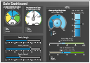 This sale dashboard example contains KPIs and sales effectiveness metrics visual indicators: speedometer gauge, dial, slider, level meter and bullet indicators.