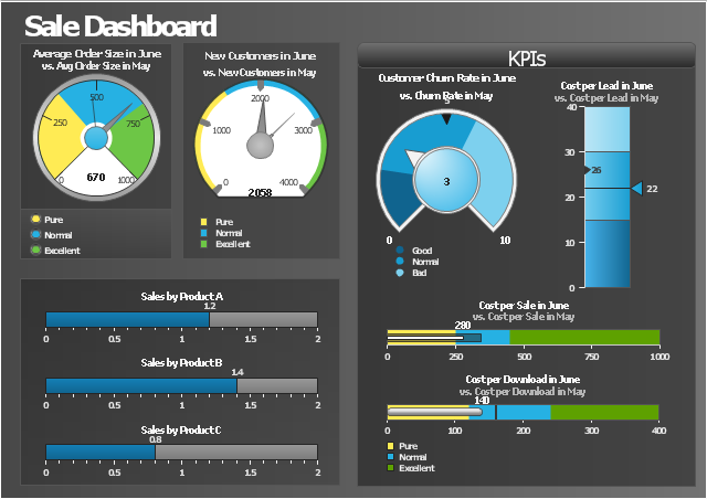 The example "Sales metrics and KPIs" was created using the ConceptDraw PRO diagramming and vector drawing software extended with the Meter Dashboard solution from the area "What is a Dashboard" of ConceptDraw Solution Park.
