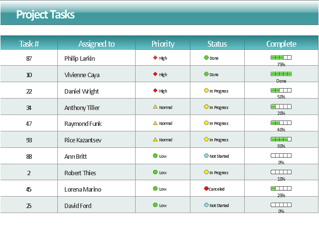 "Task management is the process of managing tasks through its life cycle. It involves planning, testing, tracking and reporting. Task management can help either individuals achieve goals, or groups of individuals collaborate and share knowledge for the accomplishment of collective goals. Tasks are also differentiated by complexity, from low to high. Effective task management requires managing all aspects of a task, including its status, priority, time, human and financial resources assignments, recurrency, notifications and so on. These can be lumped together broadly into the basic activities of task management. ... Task management may form part of project management and process management and can serve as the foundation for efficient workflow in an organisation. Project managers adhering to task-oriented management have a detailed and up-to-date project schedule, and are usually good at directing team members and moving the project forward. ... Task life cycle. The status of tasks can be described by the following states: Ready, Assigned, Terminated, Expired, Forwarded, Finished, Failed." [Task management. Wikipedia] The example "Project management task status dashboard" was created using the ConceptDraw PRO diagramming and vector drawing software extended with the Status Dashboard solution from the area "What is a Dashboard" of ConceptDraw Solution Park.