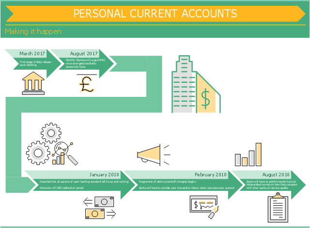 This finance infographic sample was designed on the base of the infographic "Personal current accounts Making it happen" from the the UK Government website. [gov.uk/government/uploads/system/uploads/attachment_data/file/588882/pcas-timeline-making-it-happen.pdf]