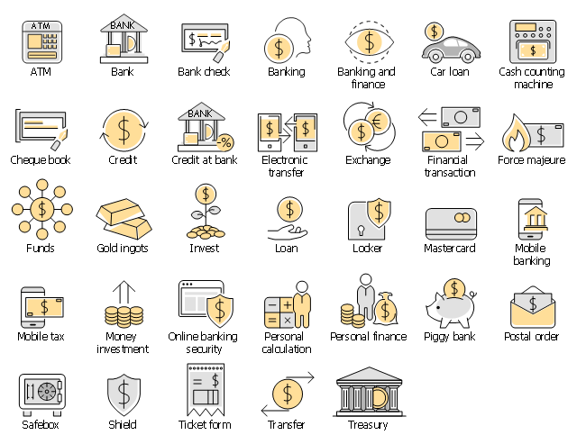 The vector stencils library "Banking" contains 33 bank icons.