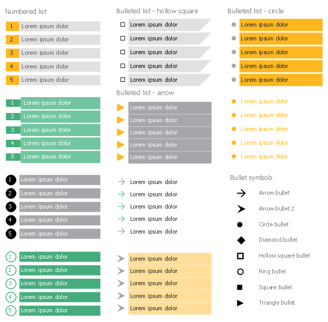 The vector stencils library "Financial lists" contains 18 list elements, including bulleted and numbered lists.