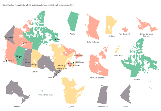 The vector stencils library "Financial map Canada" contains 14 map contours of Canada.