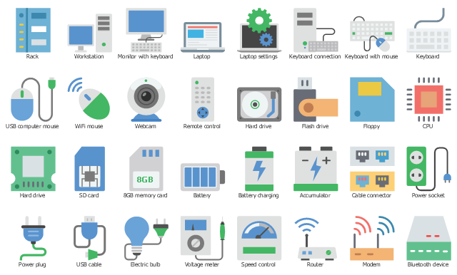 Computer equipment icon set, workstation, desktop computer, pc, wifi mouse, webcam, voltage meter, usb computer mouse, usb cable, speed test, speed control, sd card, router, remote control, rack, processor cpu, power socket, power plug, monitor, keyboard, modem device, modem signals, laptop settings, laptop, keyboard, mouse, keyboard connection, keyboard, hard drive, hard disk, hard drive, floppy, save, flash drive, electric bulb, cable connector, bluetooth device, modem, battery charging, battery, accumulator, car battery, 8GB memory card,