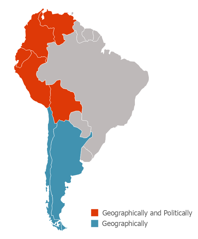The Andes occupy the western part of South America, stretching through the following countries: Colombia, Venezuela, Ecuador, Peru, Bolivia, Argentina (not considered to be -geopolitically- an Andean State), Chile (not considered to be -geopolitically- an Andean State)." [Andean states. Wikipedia]
