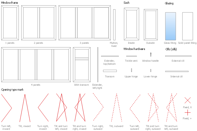 Vector stencils, window, sash, window, glass filling, window handle, window frame, upper hinge, trickle vent, transom, window frame, tilt and turn window, right-side hung sash, tilt and turn window, left-side hung sash, solid panel filling, mullion, window, lower hinge, internal cill, frame extender, top, bottom, fixed, x, fixed, +, external cill, Frame extender, left, right ,