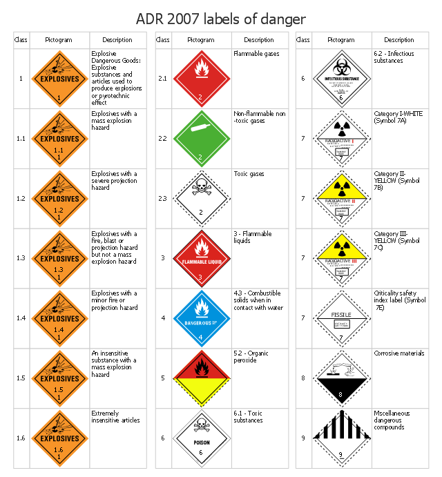 The GHS transport hazard symbols infographic example "ADR 2007 labels of danger" was designed using ConceptDraw PRO software extended with the Transport Hazard Pictograms solution from the Engineering area of ConceptDraw Solution Park.