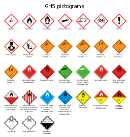 GHS hazard symbols, corrosive substances, class 8 hazard, class 6.1 toxic substances, class 5.2 oxidizing peroxides, class 5.1 oxidizing substances, class 4.3 dangerous when wet, class 4.2 spontaneously combustible, class 4.1 flammable solids, class 3 flammable liquids, class 2.3 toxic gases, class 2.2 non-flammable non-toxic gases, class 2.1 flammable gases, class 1 explosives, division 1.6, class 1 explosives, division 1.5, class 1 explosives, division 1.4, class 1 explosives, division 1.3, class 1 explosives, division 1.2, class 1 explosives, division 1.1, GHS09 environmental hazard, hazard communication standard pictogram, environment, aquatic toxicity, GHS08 health hazard, hazard communication standard pictogram, health hazard, GHS07 harmful, hazard communication standard pictogram, exclamation mark, GHS06 toxic, hazard communication standard pictogram, skull and crossbones, GHS05 corrosive, hazard communication standard pictogram, corrosion, GHS04 compressed gas, hazard communication standard pictogram, gas cylinder, GHS03 oxidizing, hazard communication standard pictogram, flame over circle, GHS02 flammable, hazard communication standard pictogram, flame, GHS01 explosive, hazard communication standard pictogram, exploding bomb,