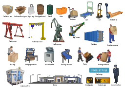Vector clip art, woodgrain, barrel, vacuum packer, stationary crane, ship, crane, porter, paper bag, packing conveyor, conveyor, packing, packaging machine, loading workmen, loading workman, warehouse worker, immigration, harbour crane, gantry crane, forklift cart, pallet truck, delivery, customs sign, customs officer, customs office, crate, container, cart, cardboard, box, cardboard box, border, border point, border sign, barrel, oil barrel,