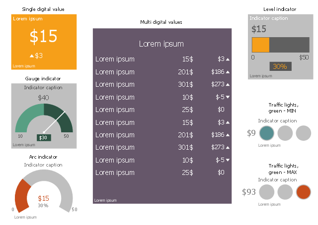 The vector stencil library "Logistic indicators" contains 7 logistic indicators: single digital value and multi digital values indicators, gauge, arc dial, level indicator, traffic lights. Use it to design your logistic dashboards with ConceptDraw PRO software. The graphic indicators example "Design elements - Logistic indicators" is included in Logistic Dashboard solution from Business Processes area of ConceptDraw Solution Park.