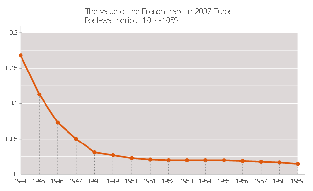 This line graph sample depicts the value of the old French franc in the post-war period, in 2007 Euros. It was redesigned from the Wikimedia Commons file: FrancEuro1944-1959.png [commons.wikimedia.org/wiki/File:FrancEuro1944-1959.png]. This file is licensed under the Creative Commons Attribution-Share Alike 3.0 Unported license. [creativecommons.org/licenses/by-sa/3.0/deed.en] "The franc (sign: F, commonly also FF or Fr) was a currency of France. Between 1360 and 1641, it was the name of coins worth 1 livre tournois and it remained in common parlance as a term for this amount of money. It was re-introduced (in decimal form) in 1795 and remained the national currency until the introduction of the euro in 1999 (for accounting purposes) and 2002 (coins and banknotes). It was a commonly held international reserve currency in the 19th and 20th centuries." [French franc. Wikipedia] The line chart example "The value of the French franc in 2007 Euros" was created using the ConceptDraw PRO diagramming and vector drawing software extended with the Line Graphs solution from the Graphs and Charts area of ConceptDraw Solution Park.