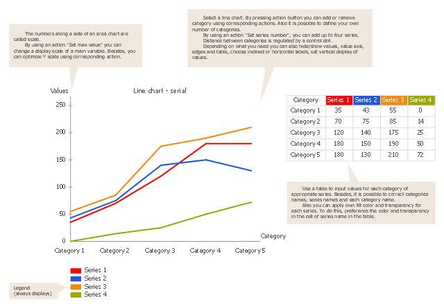 Use this template to design your line graphs. "A time series is a sequence of data points, measured typically at successive points in time spaced at uniform time intervals. ... Time series are very frequently plotted via line charts. Time series are used in statistics, signal processing, pattern recognition, econometrics, mathematical finance, weather forecasting, earthquake prediction, electroencephalography, control engineering, astronomy, and communications engineering. Time series analysis comprises methods for analyzing time series data in order to extract meaningful statistics and other characteristics of the data. Time series forecasting is the use of a model to predict future values based on previously observed values. While regression analysis is often employed in such a way as to test theories that the current values of one or more independent time series affect the current value of another time series, this type of analysis of time series is not called "time series analysis", which focuses on comparing values of time series at different points in time. Time series data have a natural temporal ordering." [Time series. Wikipedia] The line graph template for the ConceptDraw PRO diagramming and vector drawing software is included in the Line Graphs solution from the Graphs and Charts area of ConceptDraw Solution Park.