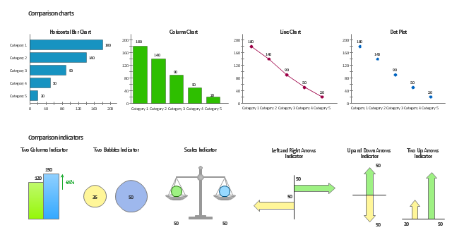 Use the design elements libraries "Comparison charts" and "Comparison indicators" to create your own business visual dashboards using the ConceptDraw PRO diagramming and vector drawing software.