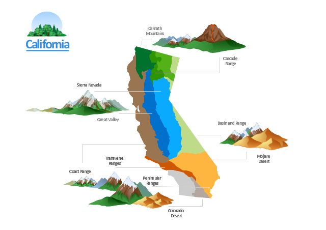 Use the Geography vector clipart library for the ConceptDraw PRO diagramming and vector drawing software to add images of geographical features as landscape and body of water into your illustrations. "Landscape comprises the visible features of an area of land, including the physical elements of landforms such as (ice-capped) mountains, hills, water bodies such as rivers, lakes, ponds and the sea, living elements of land cover including indigenous vegetation, human elements including different forms of land use, buildings and structures, and transitory elements such as lighting and weather conditions. ... The Earth has a vast range of landscapes including the icy landscapes of polar regions, mountainous landscapes, vast arid desert landscapes, islands and coastal landscapes, densely forested or wooded landscapes including past boreal forests and tropical rainforests, and agricultural landscapes of temperate and tropical regions." [Landscape. Wikipedia] The geographic illustration example California Relief is included in the Nature solution from the Illustration area of ConceptDraw Solution Park.