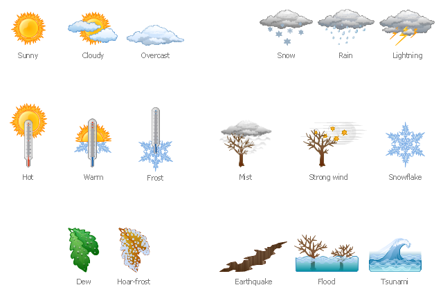 The vector stencils library Weather contains 17 symbols of meteorological conditions: sunny, cloudy, overcast, snow, rain, lighting, hot, warm, cold, mist, strong wind, flood, tsunami, dew, hoarfrost, earthquake, snowflake.