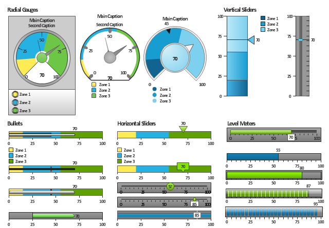 Some of them also display comparative measures, and colored zones of qualitative ranges with legend.
