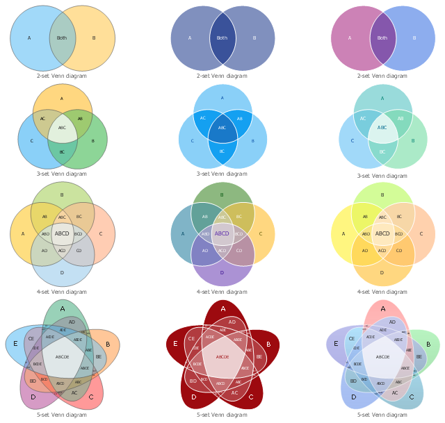 The vector stencils library "Venn diagrams" contains 12 templates. Use it for drawing Venn and Euler diagrams.