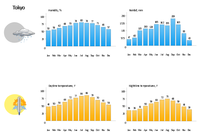 This weather conditions dashboard example depicting climate in Tokyo was drawn using the ConceptDraw PRO diagramming and vector graphics software extended with the clipart library Weather.