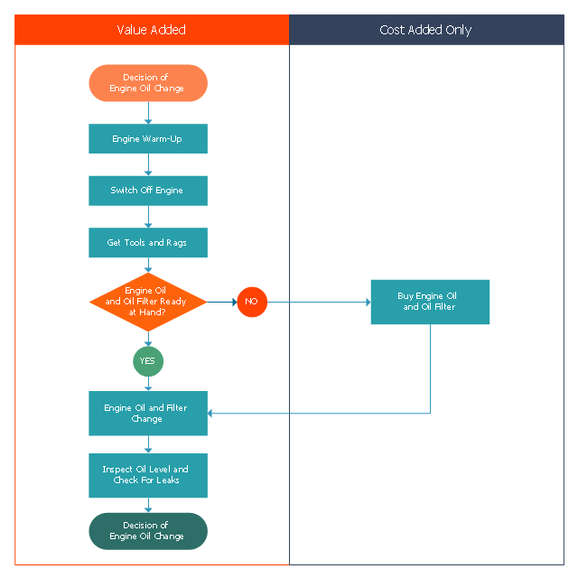This opportunity flowchart sample shows the steps involved in replacing engine oil process. The opportunity flowcharts are used in business process improvement to identify process steps which might be improved. "Business process improvement (BPI) is a systematic approach to help an organization optimize its underlying processes to achieve more efficient results. ... An organization is only as good as its processes. To be able to make the necessary changes in an organization, one needs to understand the key processes of the company. Rummler and Brache suggested a model for running a Process Improvement and Management project (PI&M), containing the following steps: 1. Identify the process to be improved (based on a critical business issue): The identification of key processes can be a formal or informal exercise. The management team might select processes by applying a set of criteria derived from strategic and tactical priorities, or process selection is based on obvious performance gaps. It is important is to select the process(es) which have the greatest impact on a competitive advantage or customer requirement. 2. Develop the objective(s) for the project based on the requirements of the process: The focus might be on quality improvement, productivity, cost, customer service or cycle time. The goal is however always the same; to get the key process under control. 3. Select the members of the cross-functional team: A horizontal (cross-functional) analysis is carried out by a team composed of representatives of all functions involved in the process. While a consultant or in-house staff person can do the job, the quality of the analysis and the commitment to change is far greater with a cross-functional team. 4. Document the current process by creating a flowchart or "organization map": Describe the process regarding the Organizational level, the Process level and the Job/Performer level according to Rummler. Develop a cross-functional process map for the process. 5. Identify "disconnects" in the process: “Disconnections” are everything that inhibit the efficiency and effectiveness of the process. The identification should be categorized into the three levels: The Organizational level, the Process level and the Job/Performer level. 6. Recommend changes (organizational, in the process or in its execution): Categorize and prioritize the main problems and possibilities, evaluate alternative solutions. Develop a cross-functional process map for the recommended process. 7. Establish process and sub-process measures: The process measures should reflect the objectives of the project. 8. Implement the improvements." [Business process improvement. Wikipedia] The swim lane diagram example "Opportunity flowchart - Replacing engine oil" was created using the ConceptDraw PRO diagramming and vector drawing software extended with the Cross-Functional Flowcharts solution from the Business Processes area of ConceptDraw Solution Park.