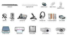 Computer peripheral devices, webcam, web camera, webcam, video projector, port adapter, optical mouse, laser printer, keyboard, joystick, inkjet printer, image scanner, earphones, headphones, computer speakers, LCD projector, IP phone, VoIP phone, Apple wireless mouse, Apple mouse, Apple keyboard,