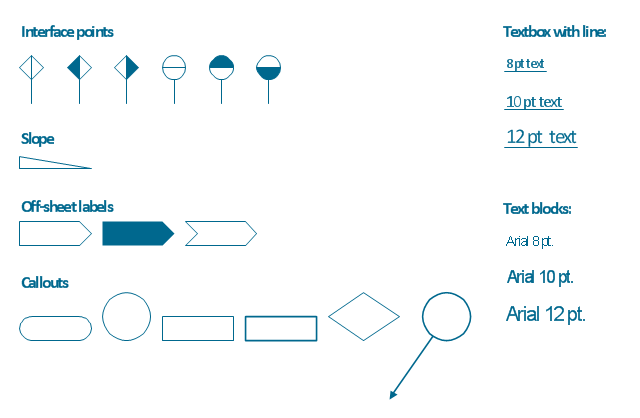 The vector stencils library "Process annotations" contains 22 symbols of interface points, slope, off-sheet labels, callouts and textboxes.