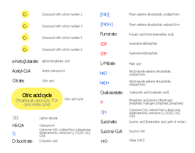 The vector stencils library "Citric acid cycle (TCA cycle)" contains 26 symbols of metabolites for drawing metabolic pathway maps and biochemical shematic diagrams of the citric acid cycle (TCA cycle, tricarboxylic acid cycle, Krebs cycle) and diagrams of metabolism processes. "The citric acid cycle - also known as the tricarboxylic acid cycle (TCA cycle), or the Krebs cycle, - is a series of chemical reactions used by all aerobic organisms to generate energy through the oxidation of acetate derived from carbohydrates, fats and proteins into carbon dioxide and chemical energy in the form of adenosine triphosphate (ATP). In addition, the cycle provides precursors of certain amino acids as well as the reducing agent NADH that is used in numerous other biochemical reactions. Its central importance to many biochemical pathways suggests that it was one of the earliest established components of cellular metabolism and may have originated abiogenically. The name of this metabolic pathway is derived from citric acid (a type of tricarboxylic acid) that is consumed and then regenerated by this sequence of reactions to complete the cycle. In addition, the cycle consumes acetate (in the form of acetyl-CoA) and water, reduces NAD+ to NADH, and produces carbon dioxide as a waste byproduct. The NADH generated by the TCA cycle is fed into the oxidative phosphorylation (electron transport) pathway. The net result of these two closely linked pathways is the oxidation of nutrients to produce usable chemical energy in the form of ATP." [Citric acid cycle. Wikipedia] The shapes example "Design elements - TCA cycle" is included in the Biology solution from the Science and Education area of ConceptDraw Solution Park.