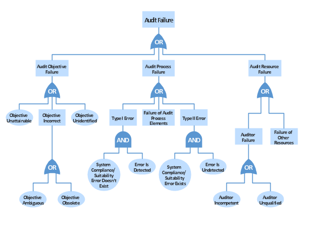 "Failure analysis is the process of collecting and analyzing data to determine the cause of a failure. It is an important discipline in many branches of manufacturing industry, such as the electronics industry, where it is a vital tool used in the development of new products and for the improvement of existing products. There are many companies which provide services to find the cause of failure in products, devices and in post disaster situations. The failure analysis process relies on collecting failed components for subsequent examination of the cause or causes of failure using a wide array of methods, especially microscopy and spectroscopy. The NDT or nondestructive testing methods (such as Industrial computed tomography scanning) are valuable because the failed products are unaffected by analysis, so inspection always starts using these methods." [Failure analysis. Wikipedia] The example "Audit failure - Fault tree analysis diagram" was created using the ConceptDraw PRO diagramming and vector drawing software extended with the Fault Tree Analysis Diagrams solution from the Engineering area of ConceptDraw Solution Park.