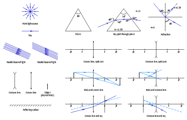Use these shapes for drawing schemes of physical experiments in geometrical optics and ray tracing diagrams.