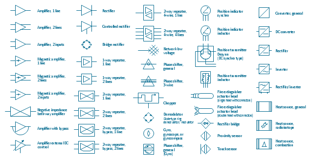 This vector stencils library contains 44 element symbols of transmitters (electronic amplifiers, repeaters), static devices (rectifiers), phase shift circuits, gyroscopes, and gyrators. Use it to design the electronic circuit diagrams and electrical schematics. "An electronic amplifier, amplifier, or (informally) amp is an electronic device that increases the power of a signal. It does this by taking energy from a power supply and controlling the output to match the input signal shape but with a larger amplitude. In this sense, an amplifier modulates the output of the power supply. There are four basic types of electronic amplifier: the voltage amplifier, the current amplifier, the transconductance amplifier, and the transresistance amplifier. A further distinction is whether the output is a linear or exponential representation of the input. Amplifiers can also be categorized by their physical placement in the signal chain." [Amplifier. Wikipedia] "A rectifier is an electrical device that converts Alternating Current (AC), which periodically reverses direction, to Direct Current (DC), which flows in only one direction. The process is known as rectification. Physically, rectifiers take a number of forms, including vacuum tube diodes, mercury-arc valves, copper and selenium oxide rectifiers, semiconductor diodes, silicon-controlled rectifiers and other silicon-based semiconductor switches." [Rectifier. Wikipedia] "In telecommunications, a repeater is an electronic device that receives a signal and retransmits it at a higher level or higher power, or onto the other side of an obstruction, so that the signal can cover longer distances." [Repeater. Wikipedia] "A phase shifter is a microwave network which provides a controllable phase shift of the RF signal. Phase shifters are used in phased arrays." [Phase shift module. Wikipedia] "A vibrating structure gyroscope, standardised by IEEE as Coriolis vibratory gyroscope (CVG), is a wide group of gyroscope using solid-state resonators of different shapes that functions much like the halteres of an insect. The underlying physical principle is that a vibrating object tends to continue vibrating in the same plane as its support rotates. In the engineering literature, this type of device is also known as a Coriolis vibratory gyro because as the plane of oscillation is rotated, the response detected by the transducer results from the Coriolis term in its equations of motion ("Coriolis force"). Vibrating structure gyroscopes are simpler and cheaper than conventional rotating gyroscopes of similar accuracy. Miniature devices using this principle are a relatively inexpensive type of attitude indicator." [Vibrating structure gyroscope. Wikipedia] The example "Design elements - Composite assemblies" was drawn using the ConceptDraw PRO diagramming and vector drawing software extended with the Electrical Engineering solution from the Engineering area of ConceptDraw Solution Park.