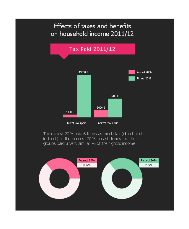 The bar graph and donut chart sample "Effects of taxes and benefits" was created using the ConceptDraw PRO diagramming and vector graphics software extended with the Data-driven Infographics" solution from the area "What is infographics" of ConceptDraw Solution Park.
