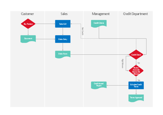 "Trade credit. The word credit is used in commercial trade in the term "trade credit" to refer to the approval for delayed payments for purchased goods. Credit is sometimes not granted to a person who has financial instability or difficulty. Companies frequently offer credit to their customers as part of the terms of a purchase agreement. Organizations that offer credit to their customers frequently employ a credit manager." [Credit (finance). Wikipedia] The vertical cross-functional flowchart example "Credit approval process" was created using the ConceptDraw PRO diagramming and vector drawing software extended with the Flowcharts solution from the area "What is a Diagram" of ConceptDraw Solution Park.