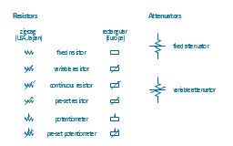 Resistor symbols, variable resistor, resistor, variable attenuator, attenuator, pre-set resistor, resistor, pre-set potentiometer, potentiometer, potentiometer, fixed resistor, resistor, fixed attenuator, attenuator, continuous resistor, resistor,