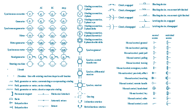 The vector stencils lybrary "Rotating equipment" contains 55 symbols of rotating equipment: converters, generators, motors, rotating machines, and their parts and labels. Use to design systems containing rotating electrical equipment (i.e., motors), armatures, brushes, and related mechanical devices ( brakes, gearing, clutches, interlocks). "The academic study of electric machines is the universal study of electric motors and electric generators. By the classic definition, electric machine is synonymous with electric motor or electric generator, all of which are electromechanical energy converters: converting electricity to mechanical power (i.e., electric motor) or mechanical power to electricity (i.e., electric generator). The movement involved in the mechanical power can be rotating or linear. Although transformers do not contain any moving parts they are also included in the family of electric machines because they utilise electromagnetic phenomena. Electric machines (i.e., electric motors) consume approximately 60% of all electricity produced. Electric machines (i.e., electric generators) produce virtually all electricity consumed. Electric machines have become so ubiquitous that they are virtually overlooked as an integral component of the entire electricity infrastructure. Developing ever more efficient electric machine technology and influencing their use are crucial to any global conservation, green energy, or alternative energy strategy." [Electric machine. Wikipedia] The shapes example "Design elements - Rotating equipment" was drawn using the ConceptDraw PRO diagramming and vector drawing software extended with the Electrical Engineering solution from the Engineering area of ConceptDraw Solution Park.