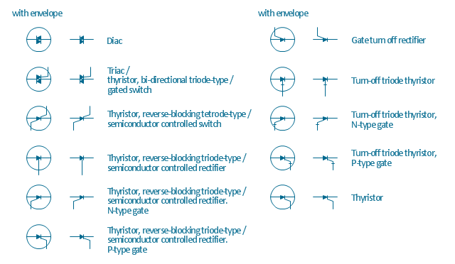 The vector stencils library "Semiconductors" contains 22 symbols of rectifiers, diodes, charge transfer and electronic conduction devices, switches, cathodes, transistors, thyristors, and transceivers for semiconductor (SIS) design. "Semiconductor devices are electronic components that exploit the electronic properties of semiconductor materials, principally silicon, germanium, and gallium arsenide, as well as organic semiconductors. Semiconductor devices have replaced thermionic devices (vacuum tubes) in most applications. They use electronic conduction in the solid state as opposed to the gaseous state or thermionic emission in a high vacuum. Semiconductor devices are manufactured both as single discrete devices and as integrated circuits (ICs), which consist of a number - from a few (as low as two) to billions - of devices manufactured and interconnected on a single semiconductor substrate, or wafer. ... All transistor types can be used as the building blocks of logic gates, which are fundamental in the design of digital circuits. In digital circuits like microprocessors, transistors act as on-off switches; in the MOSFET, for instance, the voltage applied to the gate determines whether the switch is on or off. Transistors used for analog circuits do not act as on-off switches; rather, they respond to a continuous range of inputs with a continuous range of outputs. Common analog circuits include amplifiers and oscillators. Circuits that interface or translate between digital circuits and analog circuits are known as mixed-signal circuits. Power semiconductor devices are discrete devices or integrated circuits intended for high current or high voltage applications. Power integrated circuits combine IC technology with power semiconductor technology, these are sometimes referred to as "smart" power devices. Several companies specialize in manufacturing power semiconductors." [Semiconductor device. Wikipedia] The shapes example "Design elements - Semiconductors" was drawn using the ConceptDraw PRO diagramming and vector drawing software extended with the Electrical Engineering solution from the Engineering area of ConceptDraw Solution Park.