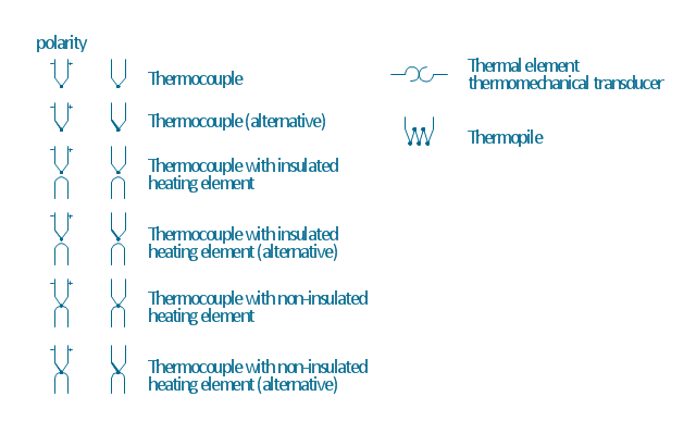 The vector stencils library "Thermo" contains 14 symbols of thermoelectric elements: thermal element, thermocouples with and without heating elements, thermoplile.
