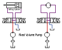 Hydraulic equipment schematic, spring, variable spring, non-variable spring, reservoir, hydraulic pump, four-port, flow path, four-port, crossed, flow path, floating motor, filter, electric linear, solenoid, double-acting, magnetic cylinder, dot, line, junction, box, flow path,