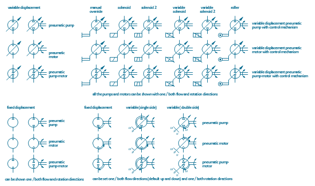 The vector stencils library "Pneumatic pumps and motors" contains 39 symbols of pneumatic pumps, motors and pump-motors for designing the engineering drawings of pneumatic circuits.