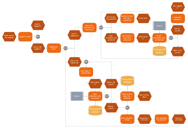 The event-driven process chain (EPC) flowchart example "Login and registration processing" was created using the ConceptDraw PRO diagramming and vector drawing software extended with the Event-driven Process Chain Diagrams solution from the Business Processes area of ConceptDraw Solution Park.