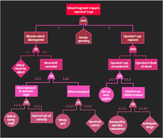 The accident analysis diagram example "Accident analytic tree" was redesigned from the picture 7-14 from the "DOE Workbook. Conducting Accident Investigations. Revision 2." "Analytic tree analyses are well defined, useful methods that graphically depict, from beginning to end, the events and conditions preceding and immediately following an accident. An analytic tree is a means of organizing information that helps the investigator conduct a deductive analysis of any system (human, equipment, or environmental) to determine critical paths of success and failure. Results from this analysis identify the details and interrelationships that must be considered to prevent the oversights, errors, and omissions that lead to failures. In accident investigations, this type of analysis can consist of both failure paths and success paths, and can lead to neutral, negative, or positive conclusions regarding accident severity. TIP. An analytic tree enables the user to: (1) Systematically identify the possible paths from events to outcome. (2) Display a graphical record of the analytical process. (3) Identify management system weaknesses and strengths." [homer.ornl.gov/sesa/corporatesafety/aip/docs/workbook/Rev2/chpt7/chapt7.htm] The FTA diagram example "Accident analytic tree" was created using the ConceptDraw PRO diagramming and vector drawing software extended with the Fault Tree Analysis Diagrams solution from the Engineering area of ConceptDraw Solution Park.